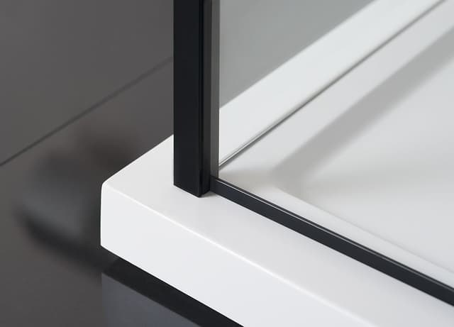 | Specjalnie zaprojektowany uchwyt do wygodnego otwierania drzwi. | Płaska uszczelka magnetyczna ukryta w aluminiowym profilu w nowoczesnym, matowym czarnym kolorze. | Nierówności ścian kryje aluminiowy profil w kolorze czarnym, z możliwością regulacji aż do 20 mm. | Obrotowy profil z funkcją podnoszenia dla wygodnego otwierania. Czysta linia – profil konczy się na tym samym poziomie jak szkło Stabilność kabiny zapewnia elegancki wspornik z regulowanym kątem do mocowania po obu stronach. |