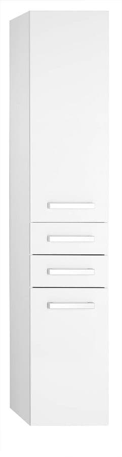 Szafki z błyszczącego białego i platynowego dębu z pięknymi ceramicznymi umywalkami. Praktyczne duże szuflady. Przedstawiamy meble VEGA i POLY, nowoczesne i wizualnie czyste meble w rozsądnej cenie.